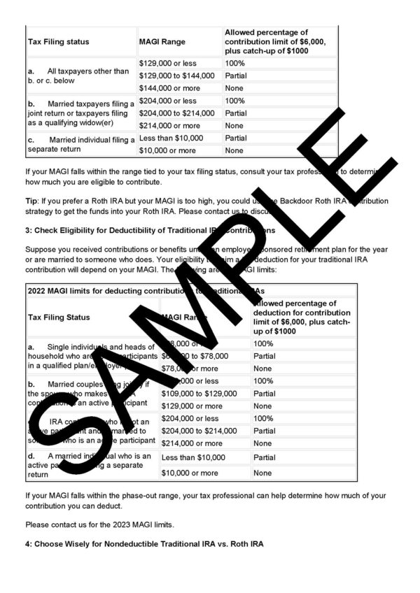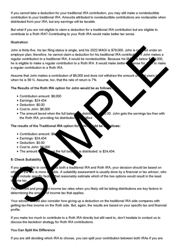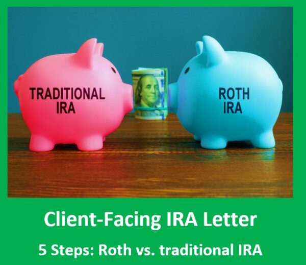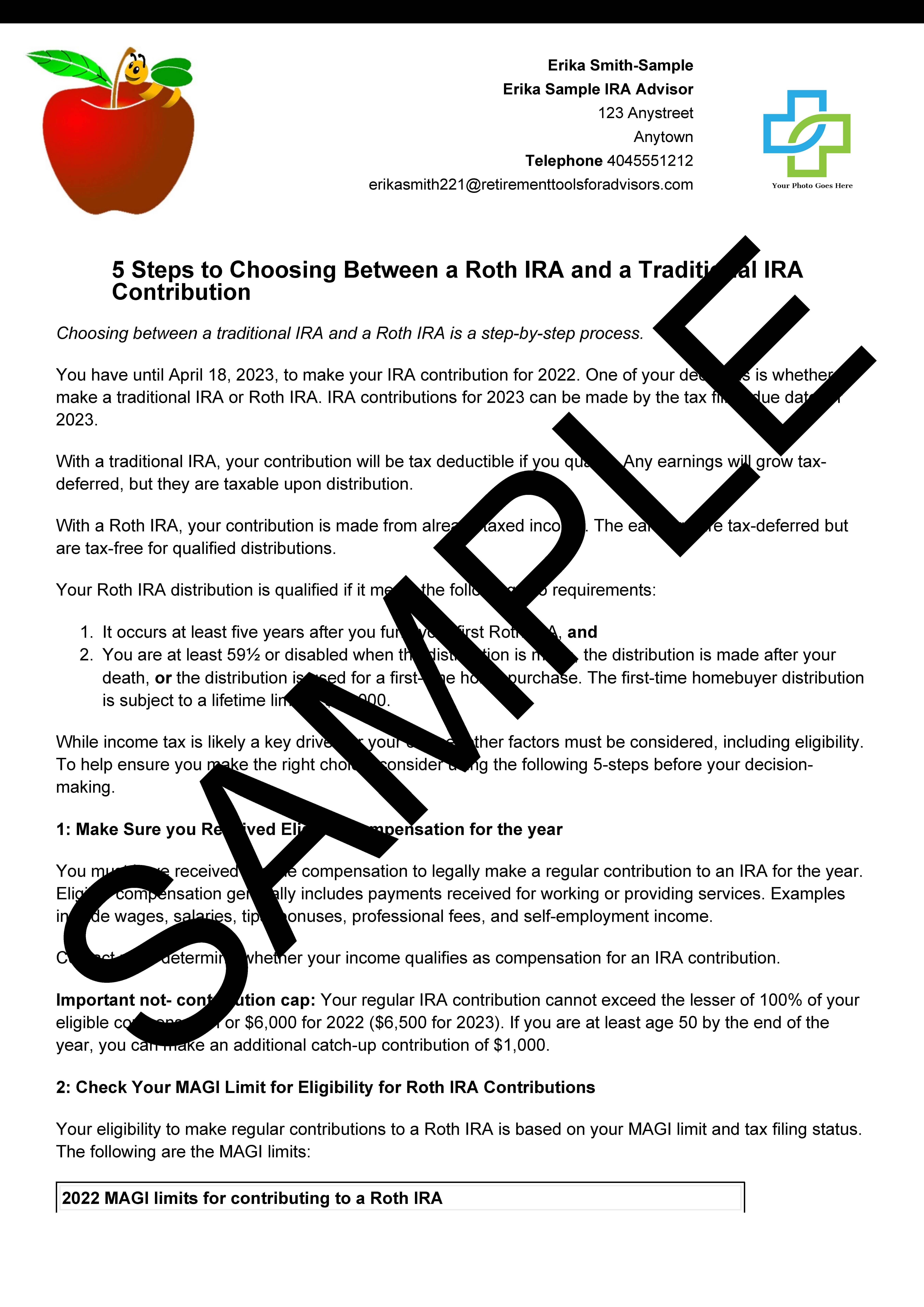 Use this letter to help clients choose between a traditional IRA contribution and a Roth IRA contribution. Topics covered include the following: