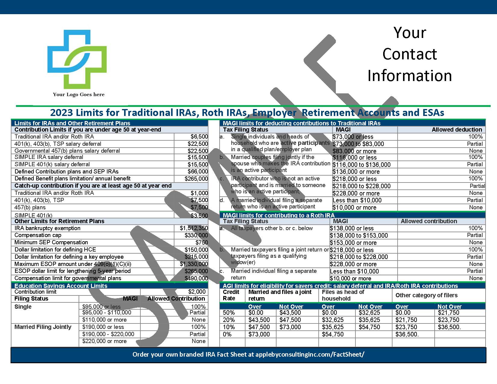 Use the IRA Fact Sheet to share information about the IRA limits for 2023. Information includes: